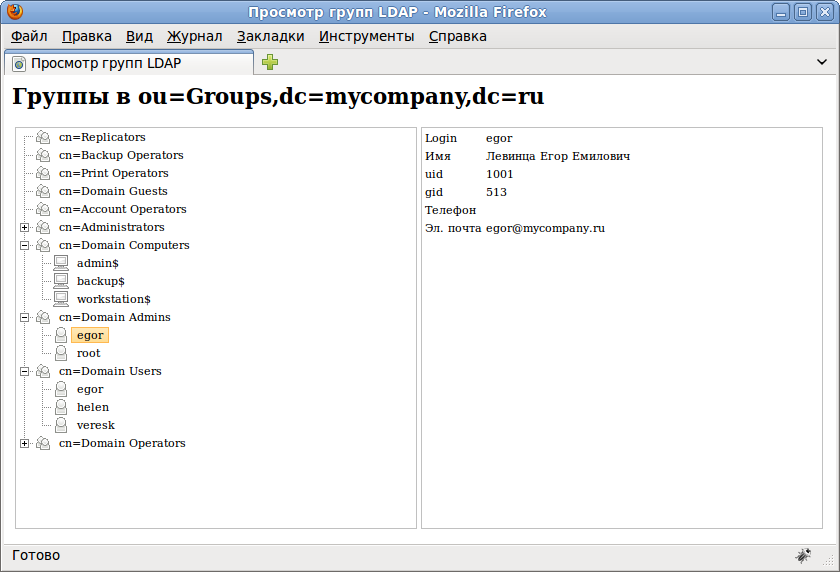 Исходные данные: имеется каталог (базовый DN dc=mycompany,dc=ru) со "стандартной" структурой для интеграции с samba: сведения об учётных записях пользователей хранятся в ветке ou=Users,dc=myconpany,dc=ru, сведения о группах пользователей — в ветке ou=Groups,dc=mycompany,dc=ru. Основная задача: отобразить нестандартную древовидную структуру: на первом уровне список групп, на втором — принадлежащие этим группам пользователи. Факультативная задача: при выборе пользователя из списка вывести некоторые сведения по нему.