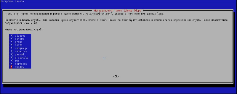 slapd запросит только пароль для админа. Имя административной записи - adminlibnss-ldap и libpam-ldap надо ставить и настраивать новые libnss-ldapd и libpam-ldapd, которые при установке спросят, что и как подменить в nsswitch.conf (ставим все галочки)