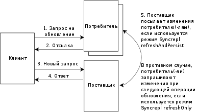 slapd(8) поддерживает репликацию, основанную на LDAP Sync, называемую syncrepl, которая может использоваться для поддержания теневых копий информации каталога на нескольких серверах службы каталога. В наиболее общем варианте такой конфигурации присутствует сервер-поставщик syncrepl и один или несколько потребителей (или теневых серверов) syncrepl. Пример конфигурации поставщик-потребитель репликации показан на рисунке 3.3. Возможна также конфигурация с несколькими поставщиками.