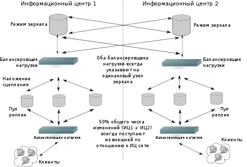 - Режим зеркала можно обозначить как два активных сервера с горячей заменой друг друга (Active-Active Hot-Standby), поэтому для принятия решения, какой из серверов-поставщиков сейчас является активным, требуется внешний сервер (slapd в режиме прокси) или устройство (аппаратный балансировщик нагрузки).