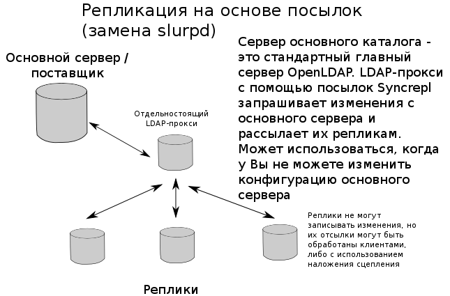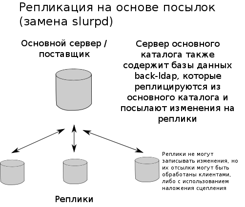 Старый механизм slurpd работал только в режиме посылок, инициированных поставщиком. Репликация Slurpd устарела в пользу репликации Syncrepl, и была полностью удалена из OpenLDAP 2.4.