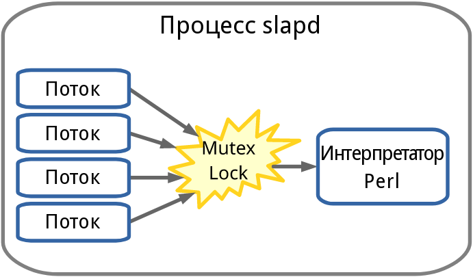Однако, у back-perl имеется ограничение, заключающееся в том, что у процесса slapd есть только один интерпретатор Perl. Теоретически в рамках одного процесса может быть создано несколько интерпретаторов Perl, но API для работы с интерпретатором не является потокобезопасным, поэтому такие интерпретаторы не могут выполняться параллельно. Следовательно, применение back-perl не является практичным, поскольку в нём в единицу времени выполняется только один обработчик Perl, хотя процесс slapd является многопоточным.