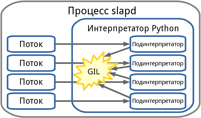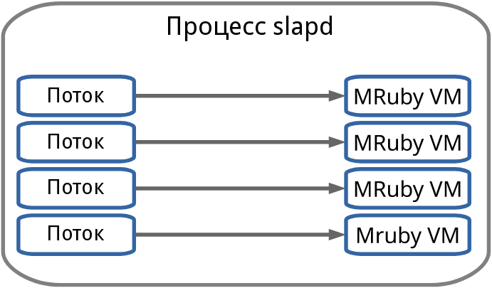 В итоге мы начали разработку механизма манипуляции данными MRuby для OpenLDAP. В рамках одного процесса мы можем создать столько виртуальных машин MRuby, сколько потребуется. MRuby решает проблему блокировок. Пространства памяти виртуальных машин полностью независимы и не влияют друг на друга. В механизме back-mruby каждому потоку slapd назначается собственная виртуальная машина MRuby. Таким образом, потоки OpenLDAP могут эффективно выполнять код Ruby в параллельном режиме.
