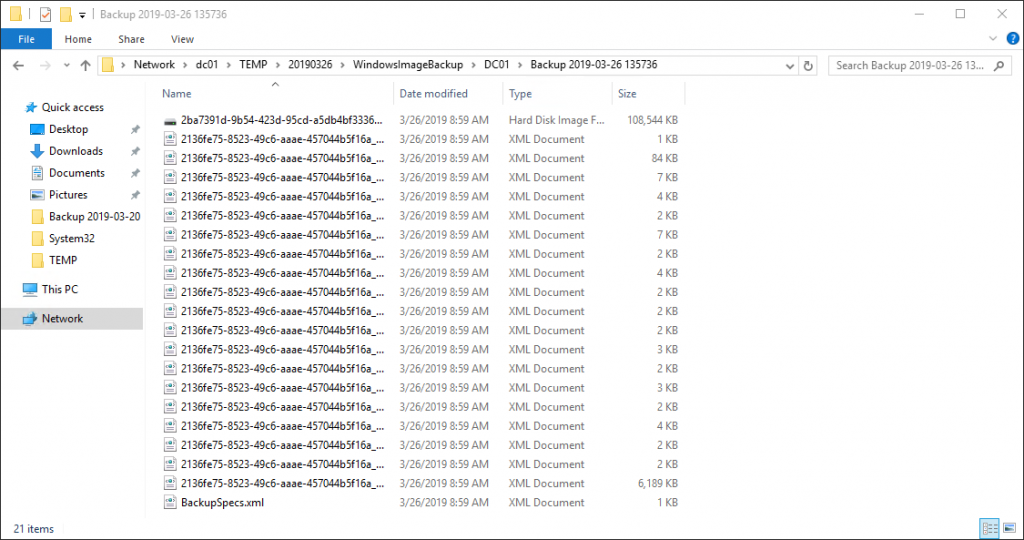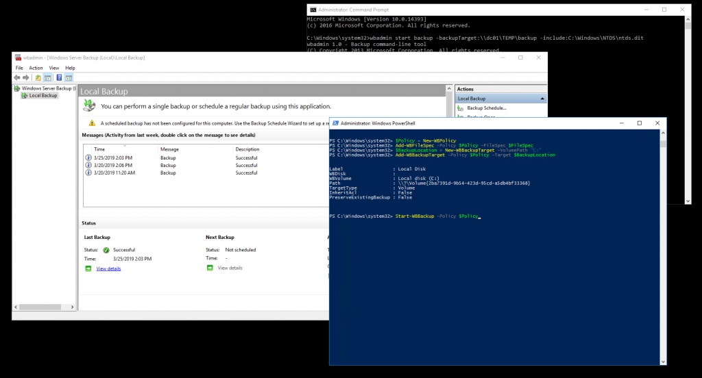 @echo off set backupRoot=\\FILESHARE\NtdsBackups\ set backupFolder=%date:~-4,4%%date:~-10,2%%date:~7,2% set backupPath=%backupRoot%%backupFolder% mkdir %backupPath% wbadmin start backup -backuptarget:%backupPath% -include:C:\Windows\NTDS\ntds.dit -quiet