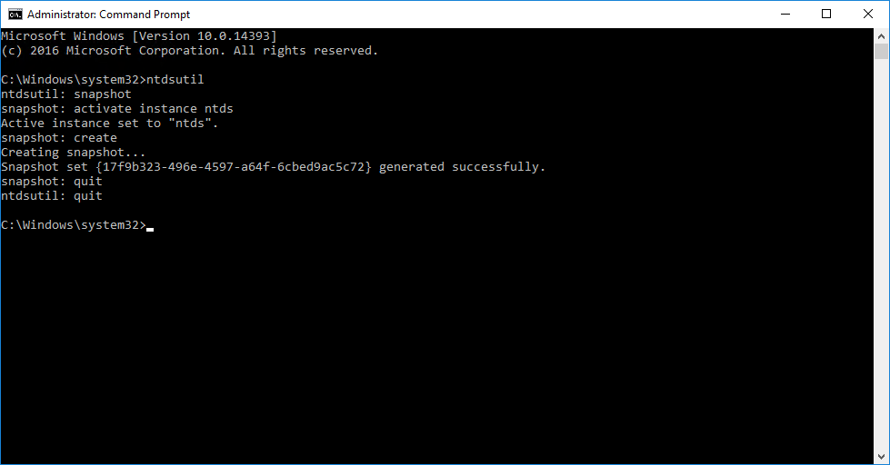 Другой вариант решения от Microsoft — NTDSUTIL.exe, утилита командной строки для доступа и управления базой данных Windows Active Directory. NTDSUTIL — экстремально мощный инструмент, и Ваше рабочее окружение — неподходящее место для изучения его возможностей. Набор полезных команд его невероятно широк, но в рамках данной заметки нас интересует команда SNAPSHOT, которая фиксирует состояние Active Directory на момент создания снапшота: