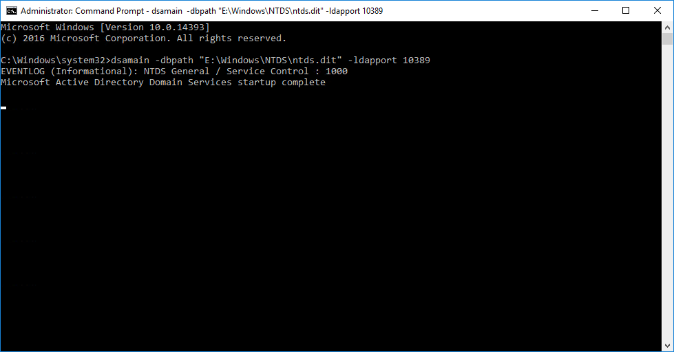dsamain -dbpath "E:\Windows\NTDS\ntds.dit" -ldapport 10389