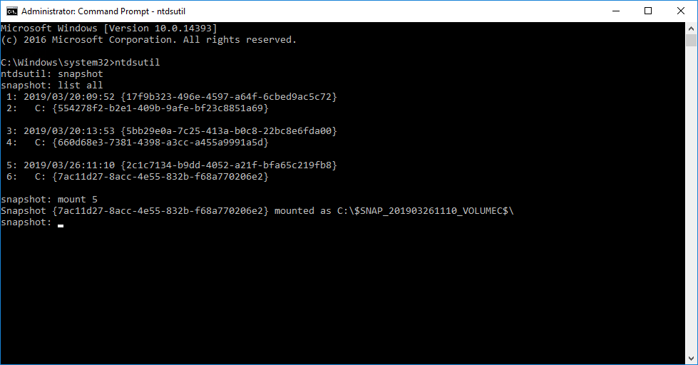 А теперь, когда мы подключили каталог из резервной копии WBADMIN, смонтируем снимок, сделанный NTDSUTIL. Для этого откроем ещё один экземпляр командной строки с правами администратора и с помощью команды snapshot утилиты ntdsutil сначала просмотрим список наших резервных копий, смонтируем одну из них и скопируем путь к диску, назначенный утилитой NTDSUTIL.