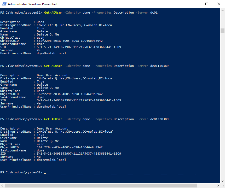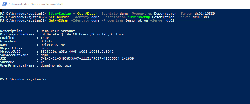 $UserBackup = Get-ADUser -Identity dqme -Properties Description -Server dc01:10389 Set-ADUser -Identity dqme -Description $UserBackup.Description -Server dc01:389