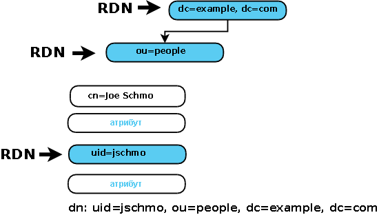 Как правило, нет разницы, значение какого атрибута используется при добавлении записи, лишь бы соблюдалось условие уникальности 'dn:'. В последней записи приведённого примера для этой цели было решено использовать cn=Joe Schmo. Точно также можно было бы использовать uid=jschmo. В процессе поиска LDAP может быть использован любой атрибут или комбинация атрибутов, так что записи могут быть найдены независимо от того, какое значение 'dn:' использовалось при их создании. Во избежание излишних операций поиска, в большинстве случаев имеет смысл использовать значение 'dn:', представляющее собой тот DN, который чаще всего будет использоваться для доступа к записи. Таким образом, в предыдущем примере подразумевается, что чаще всего при обращении к каталогу будет использоваться атрибут cn=.