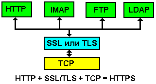 TLS/SSL работают поверх TCP, но ниже по уровню тех конечных пользовательских протоколов, которые они защищают, таких как HTTP или IMAP (как показано на рисунке 1):